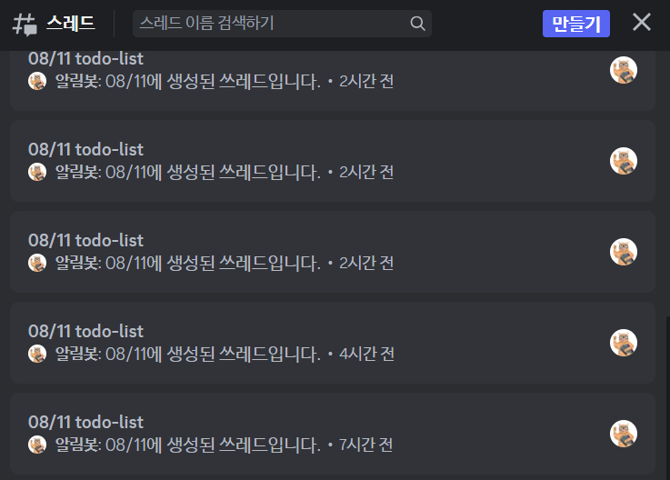 내가 만들고 싶은 봇은 매일 오전 9시 투두리스트 채널에 스레드를 생성하는 봇이다.